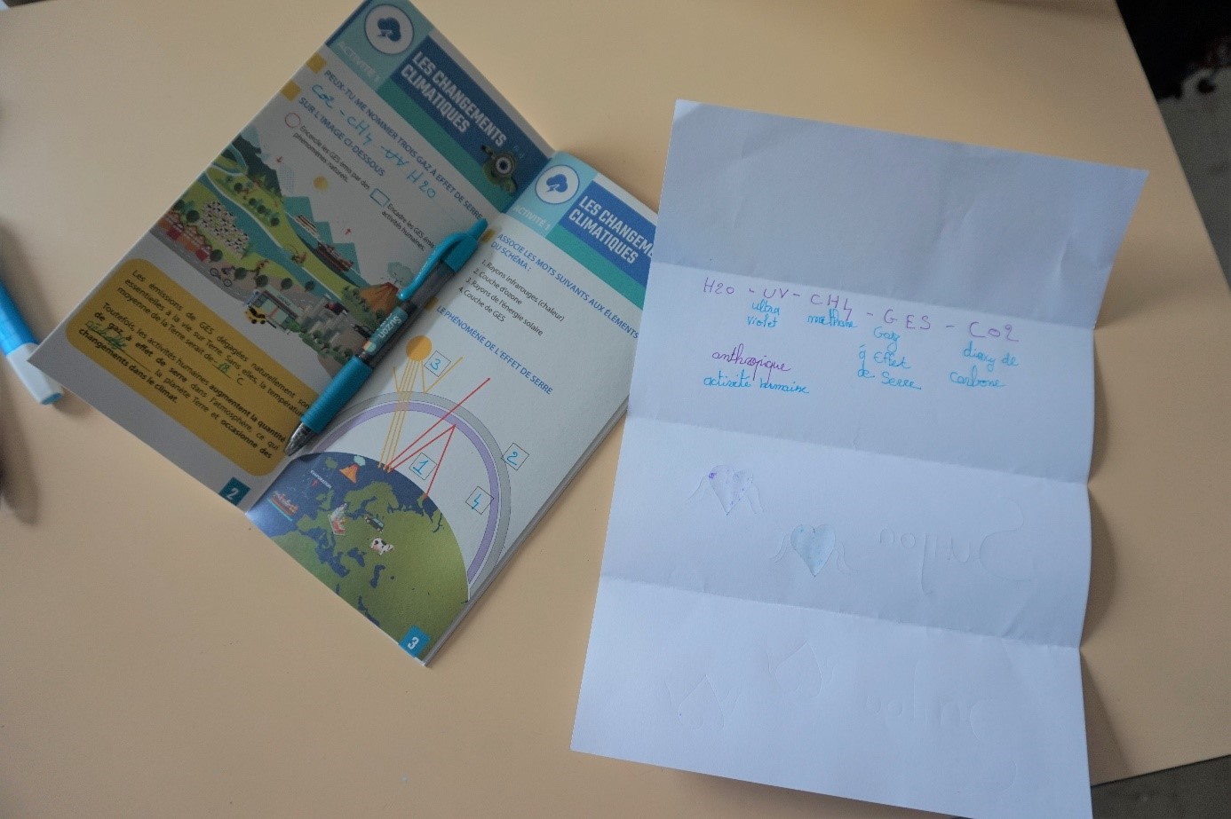 Par la suite, Christine Reinagel, animatrice du programme Carbone Scol’ERE et Julient Valat, masterformateur Carbone Scol’ERE, tous les deux animateur.ice.s de l’atelier ce jour-là, abordent plusieurs notions et expliquent leurs définitions aux élèves : qu’est-ce que sont les gaz à effet de serre, les rayons infrarouges, l’atmosphère, la couche d’ozone.